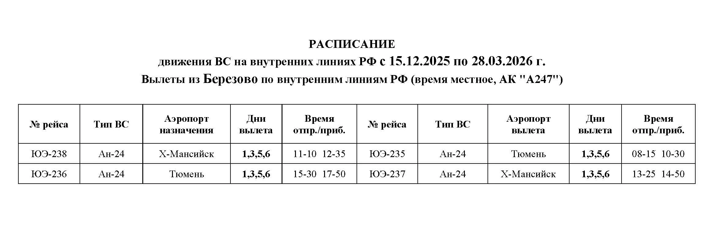 Расписание движения ВС с 15.12.2025 по 28.03.2026 (Берёзово)